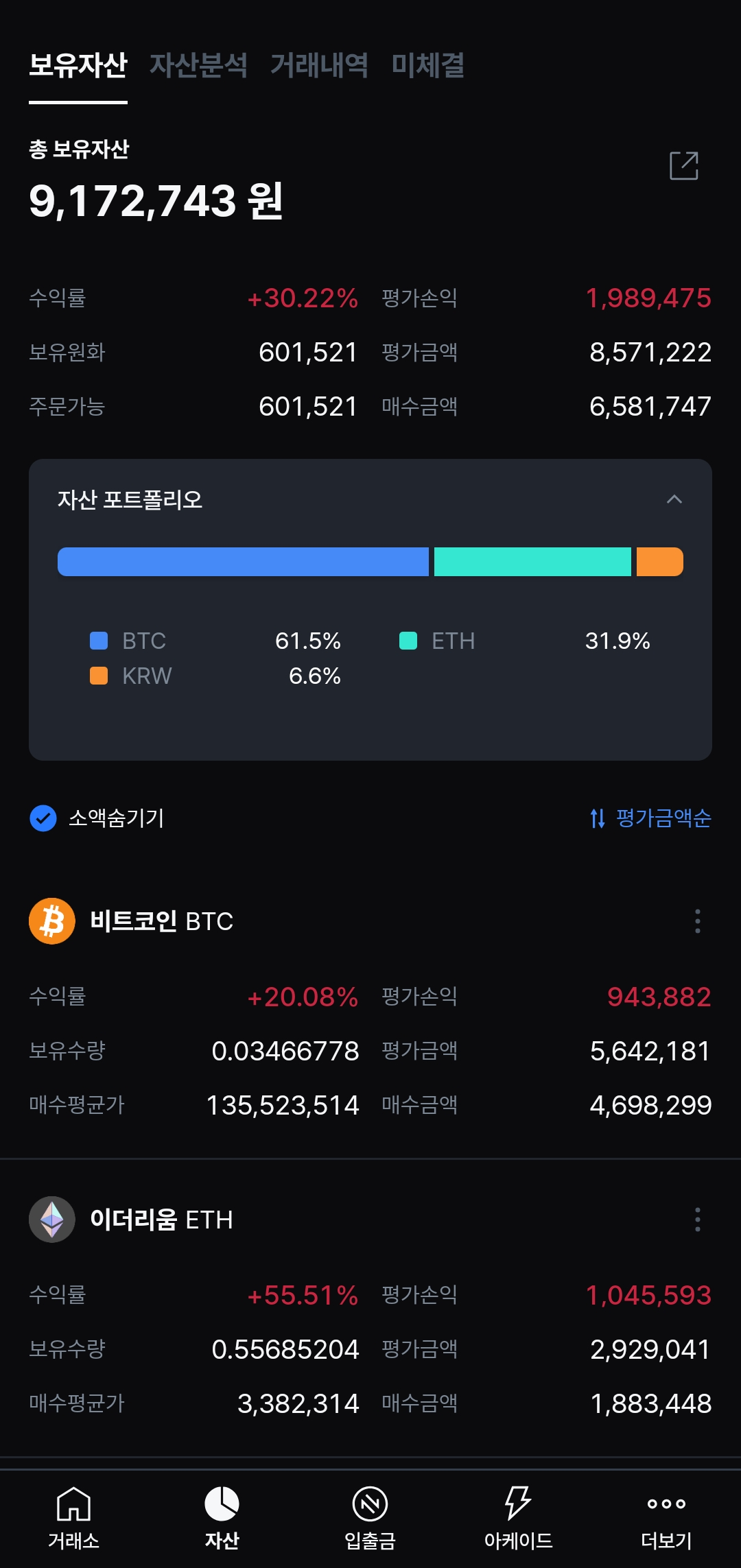 내가 20대 후반부터 30대 초까지 3~4잡을 하며 마음 버리고 몸 버리게 마는게 바로 이 코인판이다. 그 당시에는 거의 귀신이 씌었다고 할 정도로 특정 코인(알트코인)에 미쳐 있었는데 손실을 확정 짓고 난 다음(평균 매입가 2400원, 3년 뒤 매도금액 500원) 코인은 아예 들여다 보지도 않았었다. 빚 다 갚고 다시 0부터 시작할 때 투자를 마음먹으며 다짐한 것이 시장점유율 낮은 코인은 들여다 보지도 말고 소액만 조금씩 DCA 매입으로 진행하자였다. 나는 나를 못 믿기에 비트세이빙이라는 좋은 어플을 유료로 구독하며 실행했고 오랜만에 들어가보니 수익률이 제법 된다.